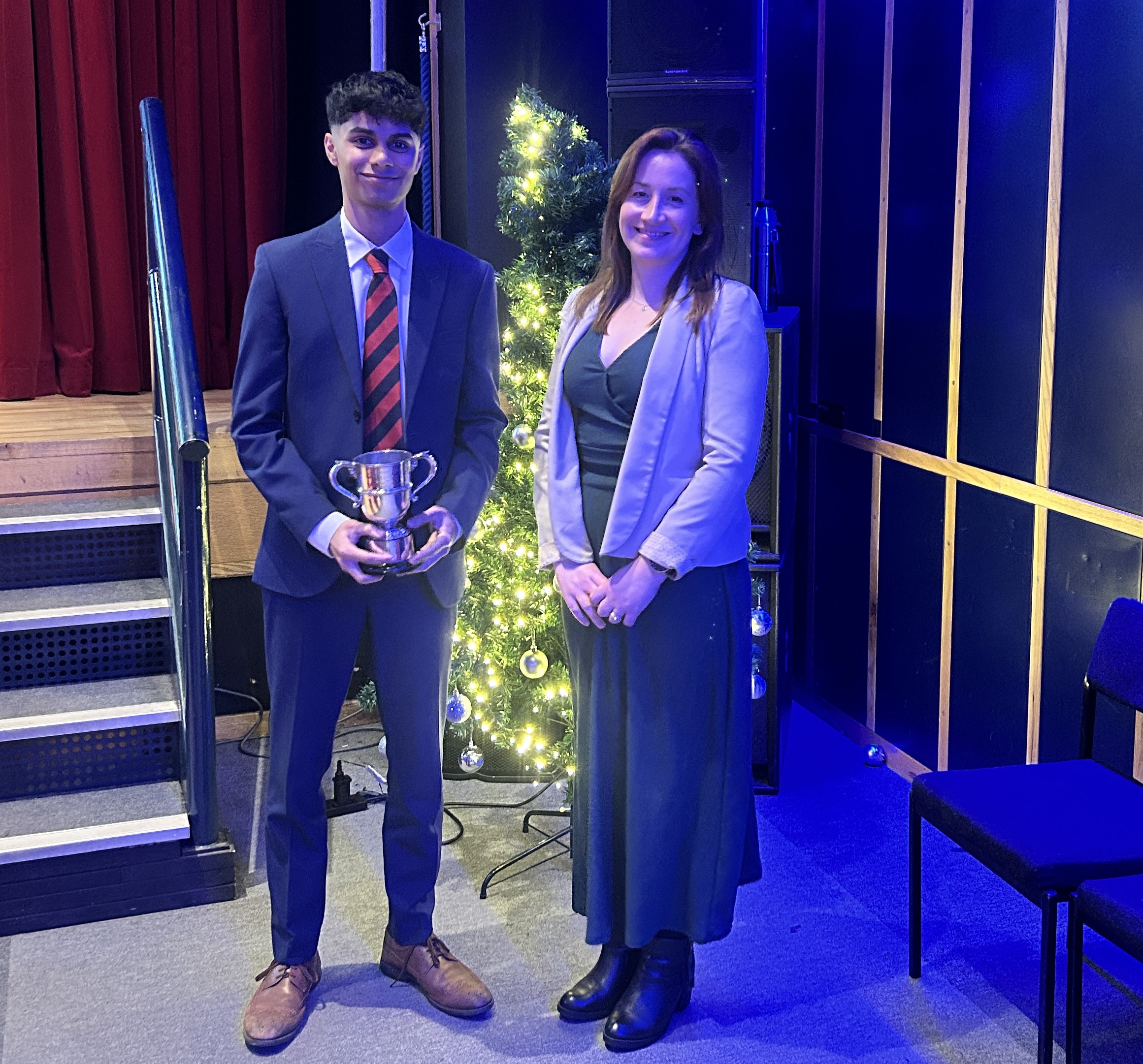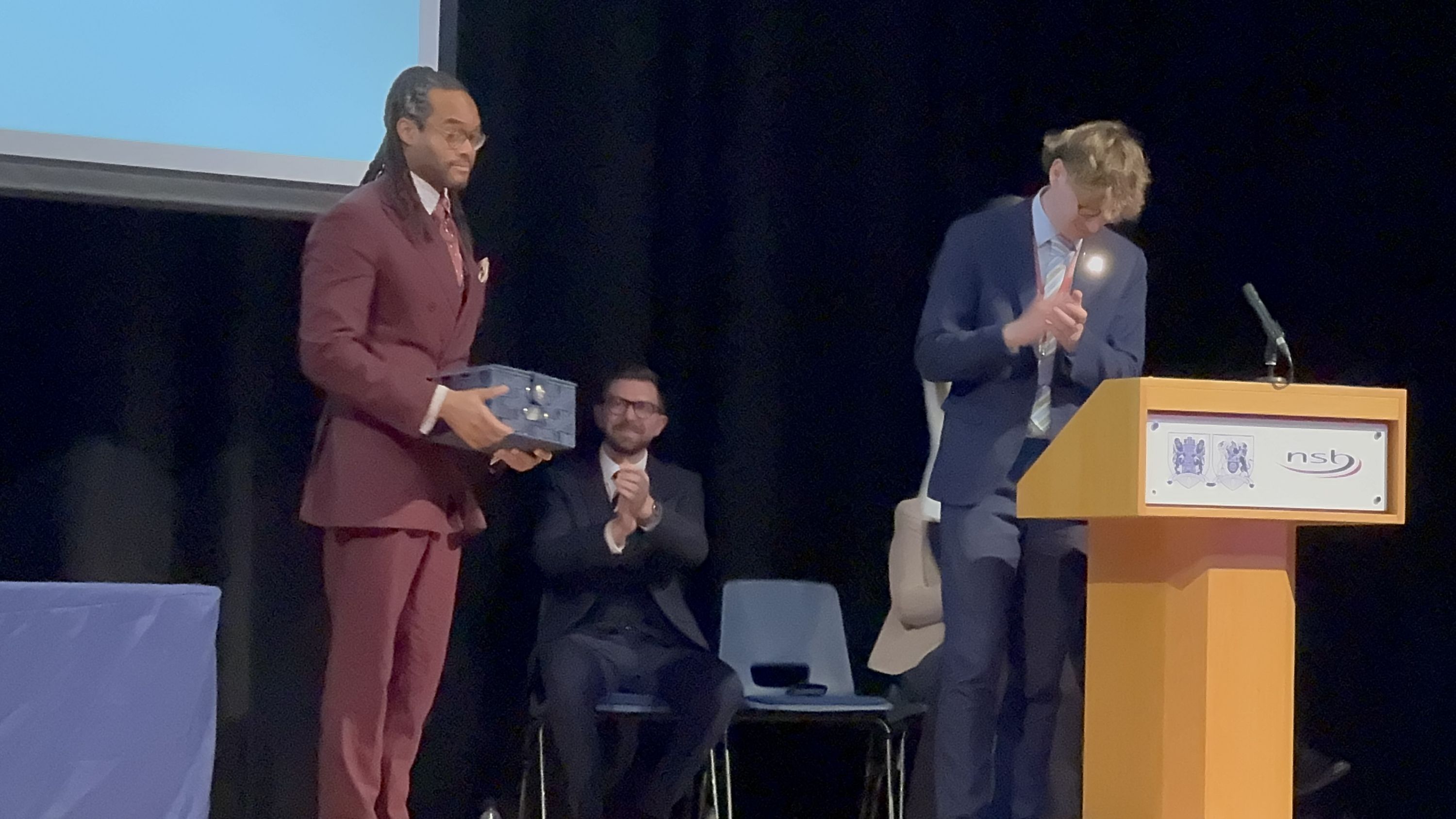 One of the highlights of the school year is our annual Academic Awards Evening which was held on Tuesday this week. We enjoyed recognising the wonderful achievements of so many students who had all done so well to secure an award given the fierce competition and exceptional levels of academic achievement at NSB. We were delighted to welcome back Antoine Allen (ITN News Journalist and former NSB student) who spoke warmly of his memories of the school and gave a fascinating insight into his work reporting across the globe in his address. We were also very pleased to welcome Dr Eleanor Peacock who is the Great Granddaughter of former Headteacher - Edward Reynolds who very much laid the foundations of the vision that we follow today of maximising student potential both in and out of the classroom. The most prestigious award of the evening is the Reynolds Award for all-round excellence which went to Mihir Kandi for outstanding academic, extracurricular and leadership throughout his time at the school. Dr Peacock and Mihir can be seen below.