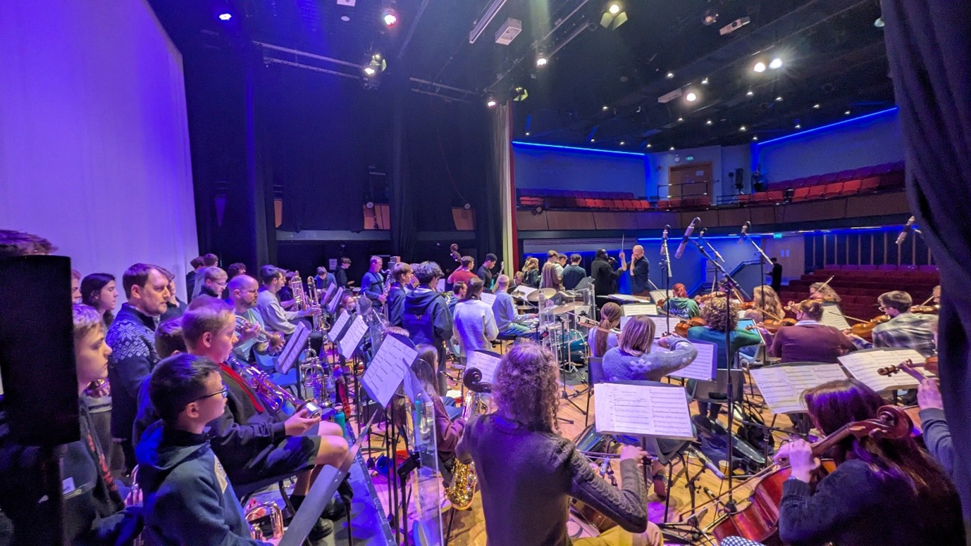 The day began at 12:30 with sectional workshops for strings, horns and rhythm section. Members of the orchestra worked side by side with our students, offering expert guidance on technique, style and—crucially—balance. With nearly 80 musicians set to share the stage that evening, managing dynamics was essential. Musical Director Mike Paul-Smith was so impressed with the standard of our string players that he invited them to perform an additional piece with the orchestra during the second half of the concert.
