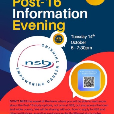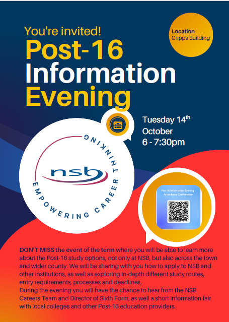 DON’T MISS the event of the term where students will be able to learn more about the Post-16 study options, not only at NSB, but also across the town and wider county. We will be sharing how to apply to NSB and other institutions, as well as exploring in-depth different study routes, entry requirements, processes and deadlines. During the evening, students will have the chance to hear from the NSB Careers Team and Director of Sixth Form, as well as a short information fair with local colleges and other Post-16 education providers.