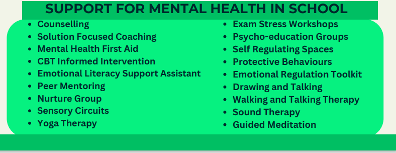 At school we have a Mental Health Team including access to counsellors and a variety of supportive approaches and we currently have 16 members of staff who have trained as Mental Health First Aiders as well as whole staff training in relation to mental health. We are able to provide some support in school and can also signpost to external services as appropriate. In addition, if there is a mental health concern you should also contact your GP.