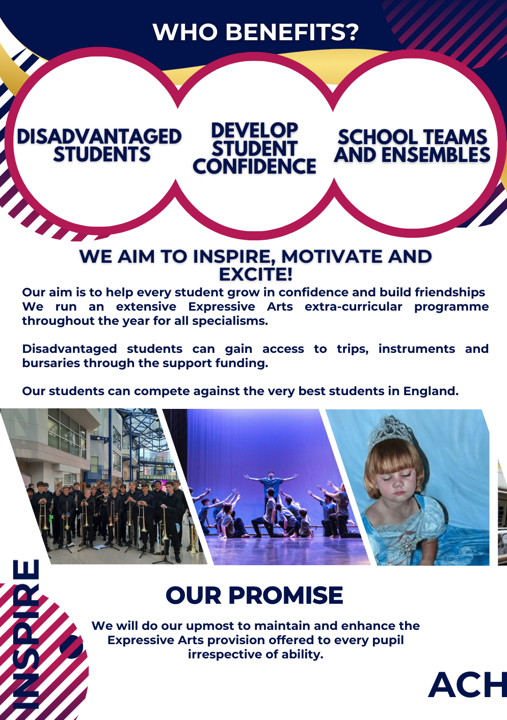 Through productions, displays, festivals, concerts we aim to inspire the pupils to both gain in confidence and reach for the stars.