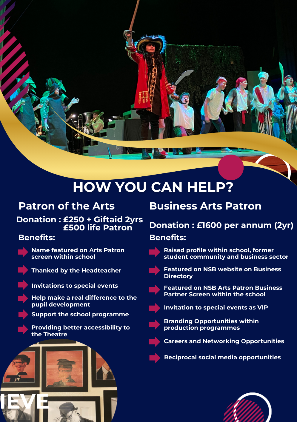By becoming a patron of the Arts you will help us to continue to offer an Arts programme of the highest quality benefitting every pupil in the school.